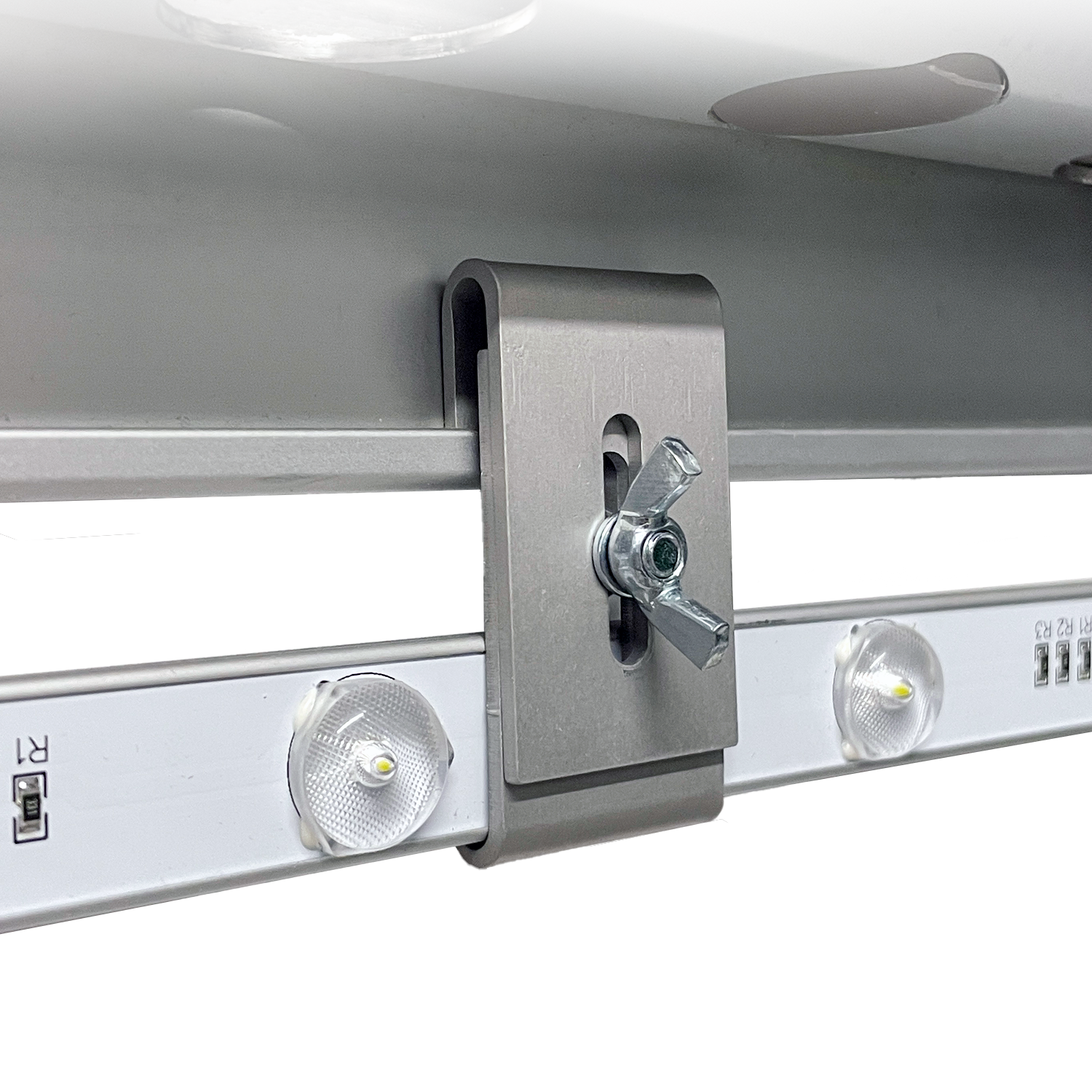 Die LED-Leiter wird mit Spannhaken direkt in das Profil der Lightbox eingesetzt. Das Power Supply passt unauffällig in das Profil und bietet eine integrierte, saubere Stromversorgung.